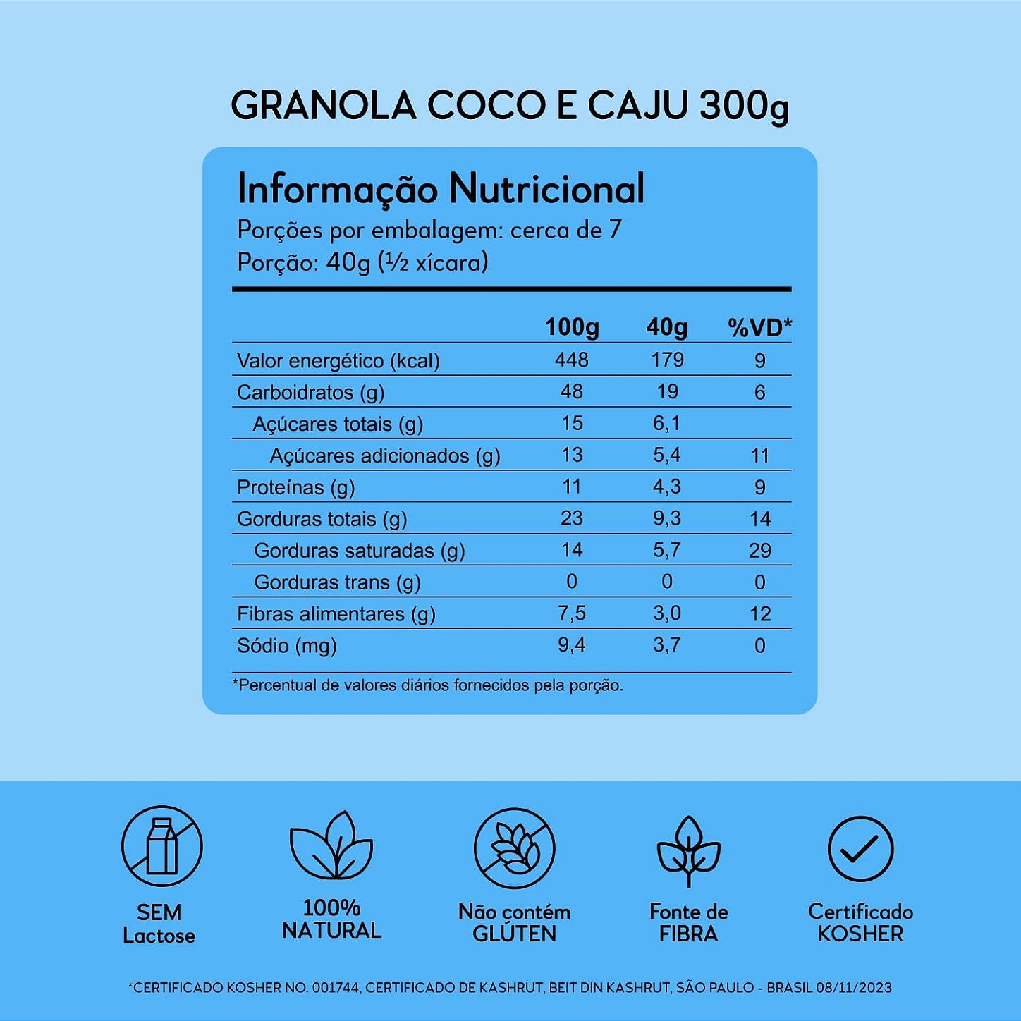 Se você segue uma dieta vegana, celíaca ou simplesmente busca reduzir o consumo de processados, este produto é o seu aliado. Diferente das granolas comuns, ela não utiliza trigo ou conservantes artificiais. É "Clean Label": você lê o rótulo e entende tudo o que está comendo.