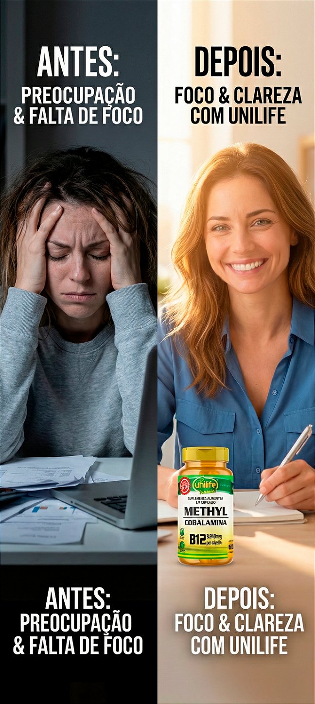 A Vitamina B12 Metilcobalamina da Unilife não é apenas mais um suplemento. É a forma ativa e natural da B12, pronta para ser absorvida pelo seu corpo imediatamente, sem precisar de conversão. Diferente da B12 comum (cianocobalamina), a metilcobalamina age diretamente no sistema nervoso, combatendo o "nevoeiro mental", melhorando o foco e devolvendo a energia que você precisa para o dia a dia.